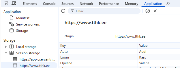 Minge Aplication -> Storage ja avage SessionStorage. Nii saate näha lisatud andmeid.