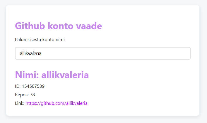 On loodud leht mes teeb päringu GitHubi ja näitab valiku infot (ID, Repos, Link)