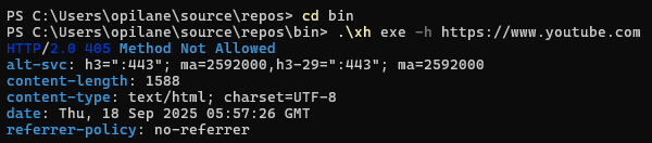 Ülesandes tuli saata HTTP-päring veebiserverile, kasutades käsurea tööriista .\xh exe -h …url.., nimg vaadata, milliseid küpsiseid (cookies) server vastuseks saadab.
