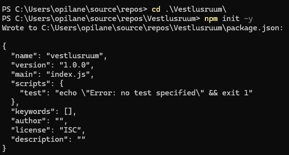 Ava kaust ja loo fail package.json käsuga npm init -y.
